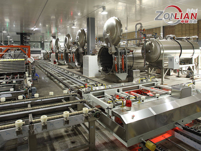 杀菌自动化生产线旨于实现从产品灌装后的自动整理及输送,到产品装盘、杀菌、卸盘的整线自动化,具有高效、节能、减少工人等劳动强度等性能优点。